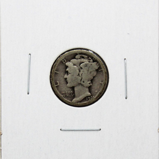 Although this coin is commonly called the Mercury dime, the main device is in fact a representation of Liberty. The wings crowning her cap are intended to symbolize liberty of thought. The designer's monogram A W is to the right of the neck. The Mint also created a 2016 gold Mercury dime at a smaller dimension. The 1921-D Mercury dime, like its Philadelphia-mint counterpart, is a very scarce semi-key coin in all grades. It has the second-lowest mintage in the series, behind only the elusive 1916-D Mercury dime. While the mintage for this piece is above 1 million, only a small fraction of these coins survived in collectible grades.