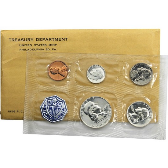 With an official mintage of 669,384, 1956 Proof sets include 1 each of the following: Franklin Half Dollar, Washington Quarter, Roosevelt Dime, Jefferson Nickel, Lincoln Wheat Cent along with a US Mint Philadelphia blue piece.