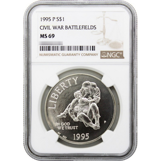 1995-P Civil War Silver Dollar BU certified MS69 NGC Brown Label, commemorates the 100th anniversary of the beginning of the protection of Civil War battlefields