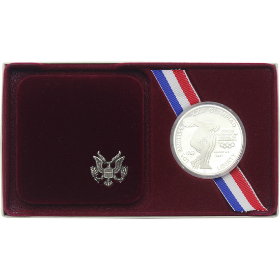 1983 San Francisco Mint (S) Olympic Discus Thrower Silver Dollar Commemorative Coin Proof (PF) in Maroon Original Government Packaging (OGP)