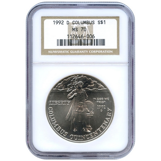 The commemorative silver dollar coin minted in 1992 to honor the 500th anniversary of Christopher Columbus' landing in the Americas. The "D" mint mark indicates that the coin was struck at the Denver Mint. The grade MS70 stands for "Mint State 70" on the Sheldon Coin Grading Scale. It is the highest grade a coin can receive and indicates a perfect, flawless specimen without any noticeable imperfections.