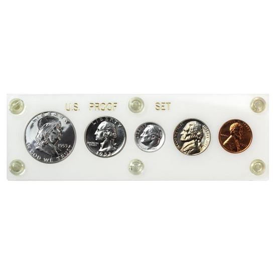 With an official mintage of 128,800, 1953 Proof sets include 1 each of the following: Franklin Half Dollar, Washington Quarter, Roosevelt Dime, Jefferson Nickel and Lincoln Wheat Cent.
