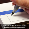 Your Happy Hanukkah Silver Round will arrive in a protective plastic capsule inside of our SilverTowne gift box made of recycled material. A premium dark grey foam insert holds your medallion snug inside the box. The package is finished with a SilverTowne original box sleeve in our Blue Ribbon design. The sleeve was designed with a blank area on the back for you to write a message or To/From on for gift-giving this holiday season. No gift wrapping or gift tags needed with this convenient option! See above for additional packaging options; from ornament capsules, other box sleeve designs, additional box options and clam shell boxes.