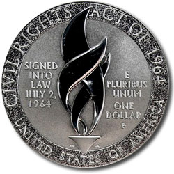 The reverse depicts three flames intertwined to symbolize freedom of education, freedom to vote, and the freedom to control one’s own destiny. The design was inspired by Martin Luther King Jr., who said: “They get the fire hose. They fail to realize that water can only put out physical fire. But water can never drown the fire of freedom.” Inscriptions are CIVIL RIGHTS ACT OF 1964, SIGNED INTO LAW JULY 2, 1964, E PLURIBUS UNUM, ONE DOLLAR and UNITED STATES OF AMERICA.