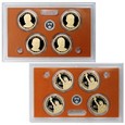 This set contains 14 coins in proof quality, encased in three clear plastic lenses and newly designed packaging. The 2014 dated quarters, half-dollar and dime are struck in 90% silver.