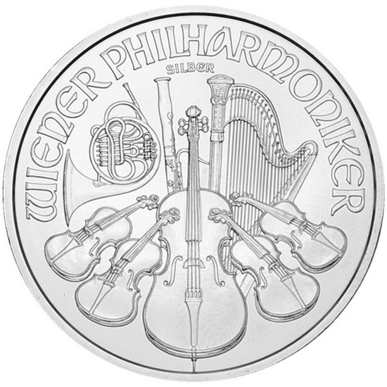 Austrian Silver Philharmonic coins feature the same obverse and reverse designs as the Gold Vienna Philharmonic coins. Both sides of the coins are unique and easily distinguishable from other bullion coins from around the world, but the reverse is perhaps the most recognizable design. The flip-side of the coin depicts a beautiful blend of musical instruments from the world-famous orchestra. These include a cello, four violins, a Vienna horn, a bassoon and a harp. They are arranged beneath the German name of the Vienna Philharmonic Orchestra, WIENER PHILHARMONIKER, and the inscription SILBER (silver in the German language).