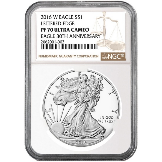 2016 marks the 30th Anniversary of the minting of the Proof Silver American Eagle. New on this 2016 version is edged lettering to celebrate the 30th anniversary - the words "30th ANNIVERSARY" is incused.