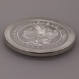 The reverse is again a replica of the original US Minted Morgan Dollar, features an Eagle, with an olive branch and three arrows in its talons, an open wreath and the motto "UNITED STATES OF AMERICA"; then instead of "In God We Trust", we've replaced that with the designation of "ONE TROY OUNCE" and instead of "ONE DOLLAR", ours has the silver fineness designation of ".999 FINE SILVER".