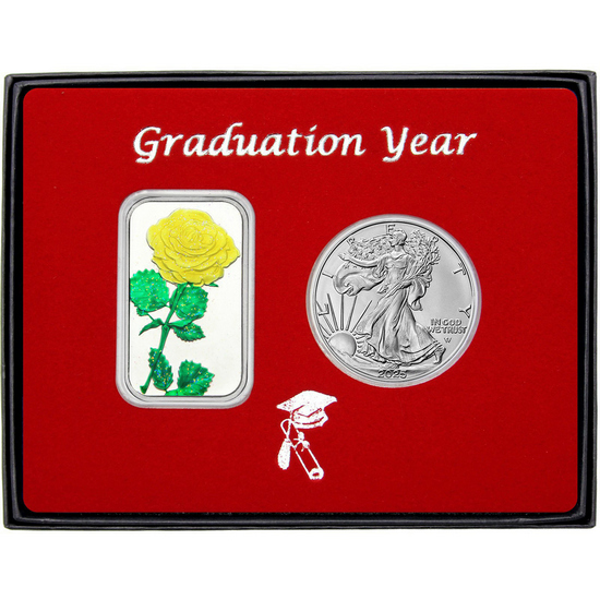 Great for a Graduation Gift, a total of 2 Troy Ounces of .999 Fine Silver. This set includes the SilverTowne Minted hand-painted enameled 1oz Yellow Rose Bar with an engravable back and the current year-dated 2025 American Silver Eagle BU issued from the US Government with a $1 Face Value.