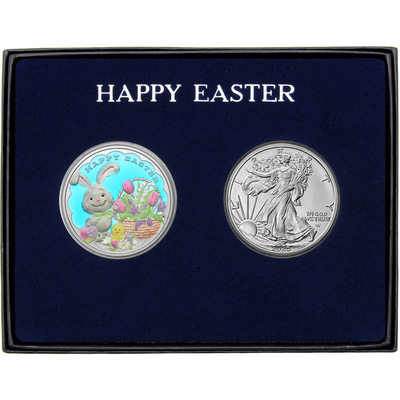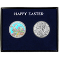 Happy Easter Bunny Rabbit Enameled Silver Round and Silver American Eagle 2pc Gift Set