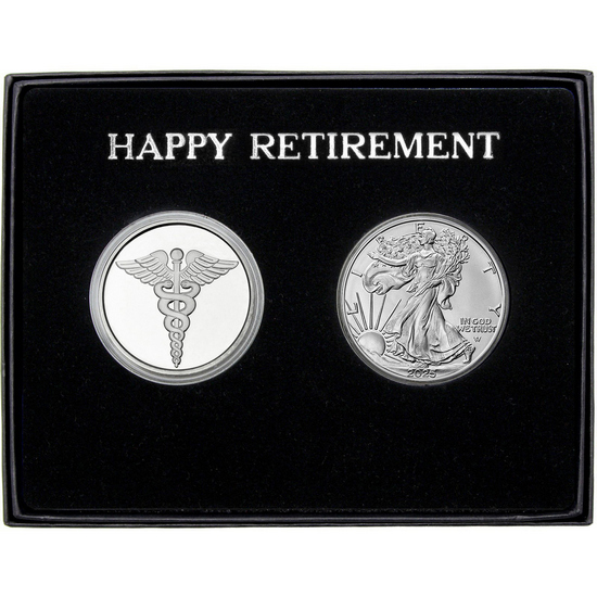 Happy Retirement Medical Silver Medallion and Silver American Eagle 2pc Gift Set