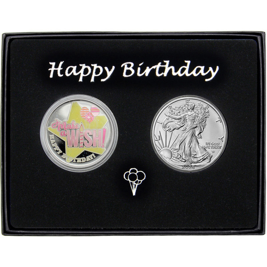 "Happy Birthday" .999 1 Troy Ounce Silver Make a Wish! Happy Birthday Hand Enameled in Pink and Glitter Round/Medallion and 2025 Dated Silver American Eagle BU 2 Piece Box with Mat Set