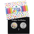 Your Birthday gift will arrive in protective plastic capsules inside of our SilverTowne black 2 piece gift box. A velvet 2 hole insert holds your silver pieces snug inside the box. Pairing perfectly with the gift, the package is finished with a SilverTowne original box sleeve in our Happy Birthday design. The sleeve was designed with a blank area on the back for you to write a message or To/From on for gift-giving. No gift wrapping or gift tags needed with this convenient option! See above for additional packaging options.