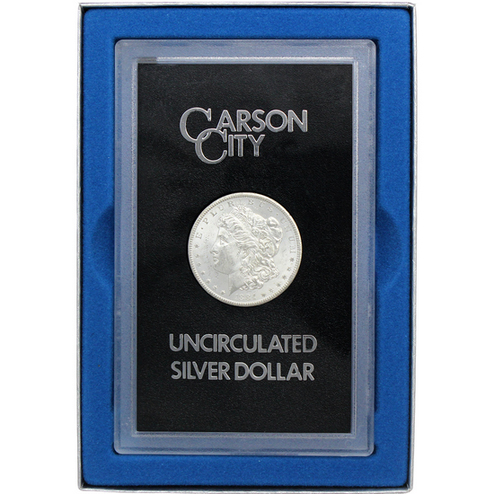 The GSA Hoard refers to a cache of Carson City Morgan Dollars that were discovered in U.S. Treasury vaults in the 20th century. These coins were stored in pristine condition and later sold to the public by the General Services Administration (GSA) in the 1970s. The GSA packaging is distinctive, typically featuring a black plastic holder with a label certifying its authenticity and origin from the hoard.