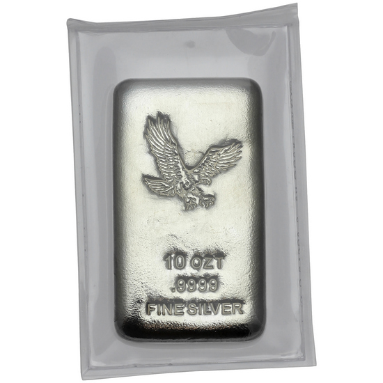 Eagle 10 Troy Ounce (oz) .9999 Fine Silver Bar made using the 'flameless tunnel' process also referred to as 'Cast'