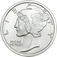 The obverse is replicated after the Winged Liberty Head (Mercury) Dime with the motto of "LIBERTY" still curved around the top rim, and "IN GOD WE TRUST" in the bottom left; Mercury/Liberty herself remains the same. The reverse is another replica image of the original Mercury Dime, the weight and purity designation replaces the original mottos with "TWO TROY OUNCE" curved around the top and ".999 SILVER" curved around the bottom to designate this piece as silver bullion with a 2 Troy Ounce weight of .999 Fine Silver.