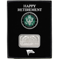 "Happy Retirement" .999 1 Troy Ounce Silver Happy Retirement Bar and 1oz Hand-Painted/Enameled Officially Licensed Army Silver Medallion 2 Piece Box with Mat Set