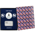 Your gift will arrive in protective plastic capsules inside of our SilverTowne black 2 piece gift box. A velvet 2 hole insert holds your silver pieces snug inside the box. Pairing perfectly with the gift, the package is finished with a SilverTowne original box sleeve in our American Flag Pattern design. The sleeve was designed with a blank area on the back for you to write a message or To/From on for gift-giving. No gift wrapping or gift tags needed with this convenient option! See above for additional packaging options.