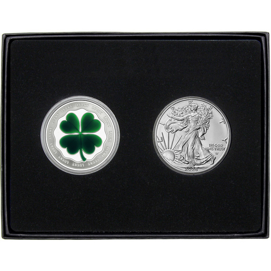 A great "Good Luck" gift, a total of 2 Troy Ounces of .999 Fine Silver. This set includes the SilverTowne Minted 1oz Lucky 4 Leaf Clover hand-painted silver round with an engravable back and the current year-dated 2025 American Silver Eagle BU issued from the US Government with a $1 Face Value.