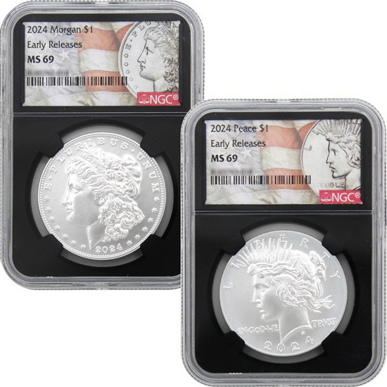 2024 (Philadelphia Minted - no mint-mark) Morgan and Peace Silver Dollar ($) Set NGC MS69 Early Release(ER) Black Core