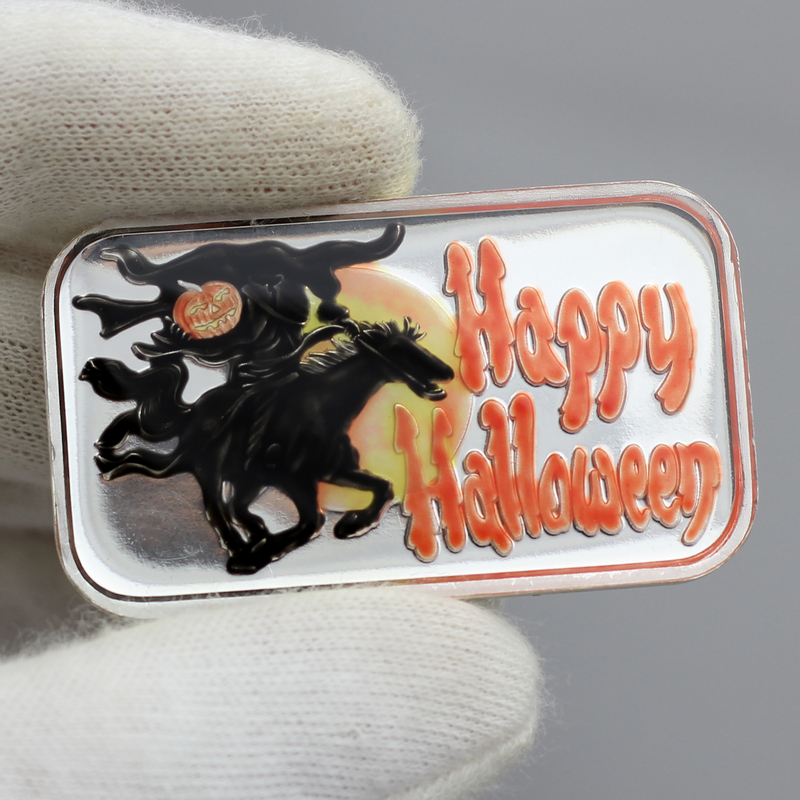 Halloween is often a time of celebration and superstition with lots of candy, spooky costumes and trick-or-treating to go around. These hand enameled/painted 1 troy ounce of .999 fine silver bars pass along the legend of The Headless Horseman and Sleepy Hollow. This year, rather than handing out candy, give a gift of an ounce Silver instead!