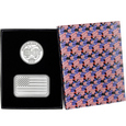 Your gift will arrive in protective plastic capsules inside of our SilverTowne black 2 piece gift box. A velvet 2 hole insert holds your silver pieces snug inside the box. Pairing perfectly with the gift, the package is finished with a SilverTowne original box sleeve in our American Flag pattern design. The sleeve was designed with a blank area on the back for you to write a message or To/From on for gift-giving. No gift wrapping or gift tags needed with this convenient option! See above for additional packaging options.