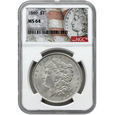 Graded MS64 by NGC, this coin exhibits impressive luster, sharp details, and minimal contact marks, making it a near-gem example. The frosty surfaces and well-struck design showcase Lady Liberty on the obverse and the majestic American eagle on the reverse, both designed by George T. Morgan. With its strong eye appeal and excellent preservation, this piece is perfect for collectors aiming to add a high-grade classic to their Morgan Dollar collection.