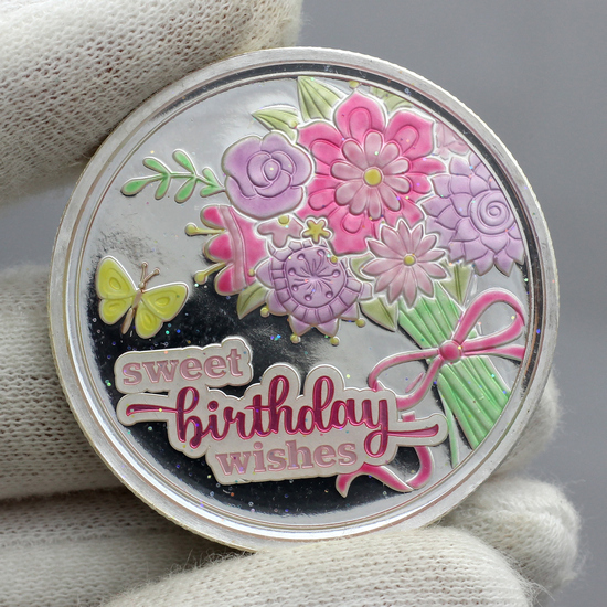 Custom minted in Winchester, Indiana, the obverse of this exclusive .999 fine silver medallion features the stylized words “Sweet Birthday Wishes” enameled in hot pink and pastel pink with a yellow butterfly. Purple and pink flowers are also shown wrapped in pretty pink ribbon with the stems and leaves hand painted in hues of green. The entire thing is topped off with a layer of glitter to make it even more stunning. The reverse features our standard current year-dated back with the weight (ONE TROY OUNCE) and purity (.999 FINE SILVER) designated around the area left blank for optional engraving.