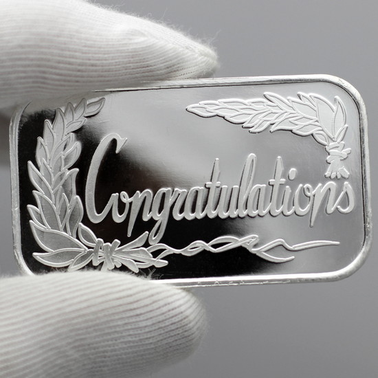 There are a lot of events in life that deserve recognition. Throughout the year, anniversaries, graduations, retirement, promotions, personal accomplishments, and more are all causes for celebration. Why not up the celebratory ante and gift the individual you are honoring silver bullion? We have a few different options for that occasion, but perhaps the best one is our Congratulations bar. It just so happens that silver piece is the silver of the month for April! Not sure what that means? Are you new here? That is A-OK, we have all the information for you below!